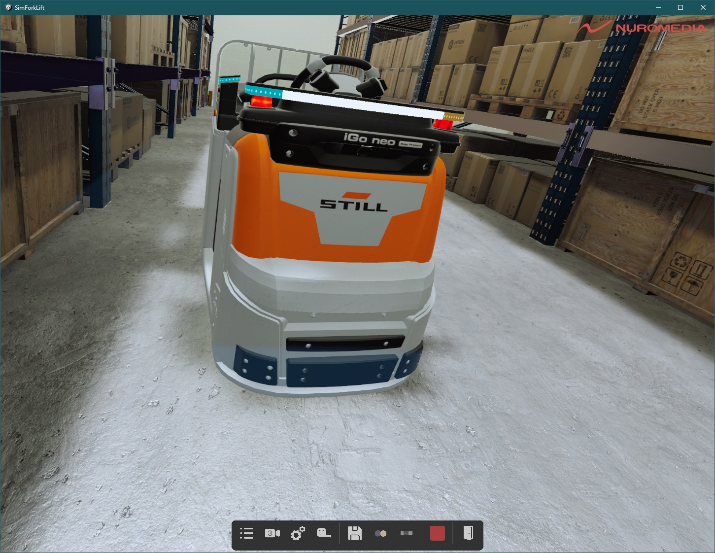 Ich entwickelte zunächst einen VR‑Digitalen Zwilling des STILL‑iGo neo, der über einen PlayStation‑4‑Controller, ein Gaming‑Lenkrad und oder eine an das Fahrzeug angebrachte Eathernet bedient werden konnte. Dieser Ansatz wurde zu einer Testumgebung ausgebaut, in der Nutzer Bremspunkte und Ausweichpfade festlegen und in einer sicheren Umgebung simulieren konnten. Die dabei gesammelten Daten dienen einer KI‑Trainingsreihe, die darauf abzielt, regulatorisch zulässige, aber für Menschen zu unangenehme Maßnahmen (z. B. abruptes Bremsen) zu optimieren. Zusätzlich erstellte ich eine zweite Anwendung, die das gesamte Lagerhaus (inklusive eines Ausstattungseditors) abbildet und synthetische Micro‑Doppler‑Radar‑Daten für das KI‑Training generiert. Diese Anwendung wurde mit einem ROS 2‑Interface ausgestattet, sodass die Simulation multi‑userfähig ist und der iGo neo über MATLAB oder Gazebo gesteuert werden kann. Ziel war es, die trainierten KI‑Modelle in einem sicheren Testumfeld insbesondere bei der Maschinen‑Mensch‑Interaktion zu validieren. Parallel unterstützte ich die Entwicklung der Wegfindungsalgorithmen für das Planungs‑Tool, das die Aufgabenverteilung und den Einsatz der autonomen Gabelstapler plant.